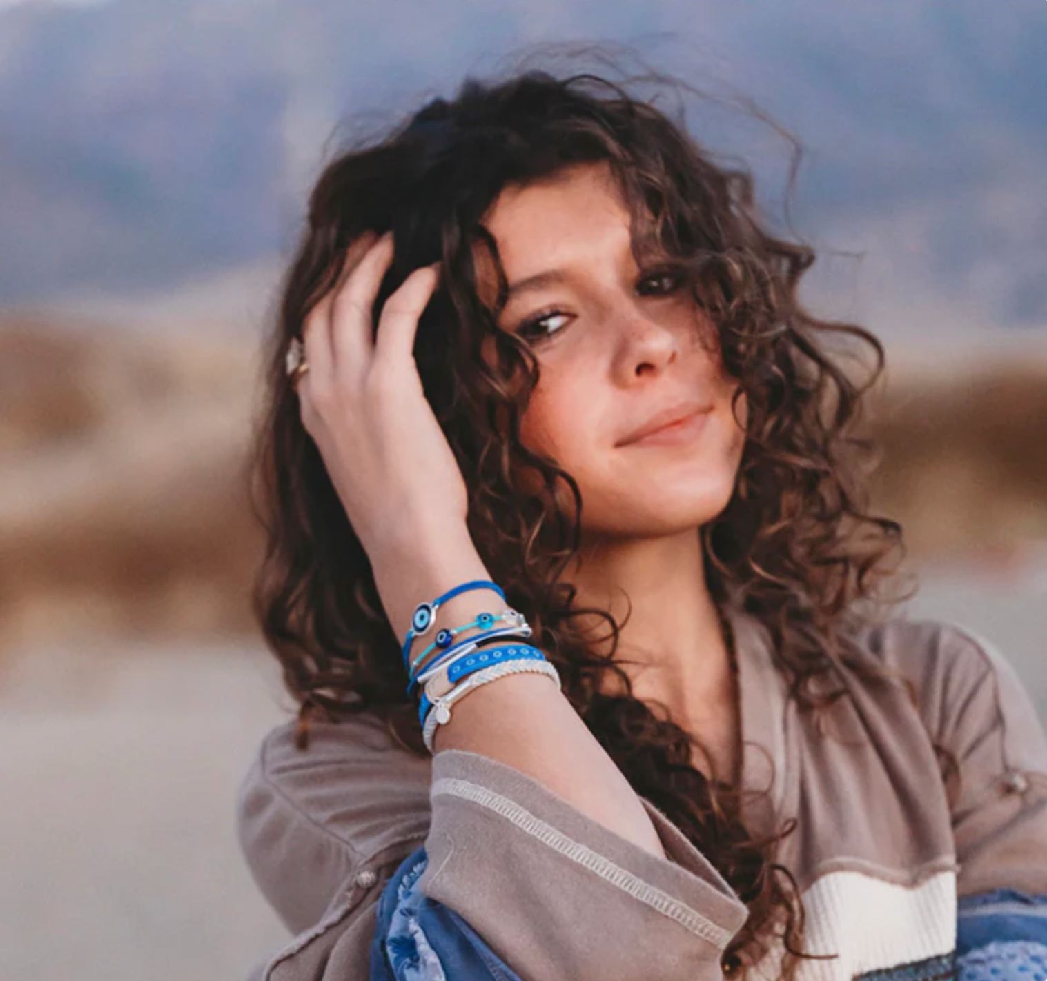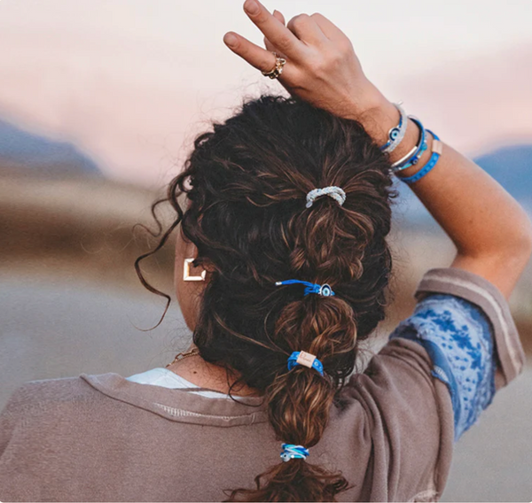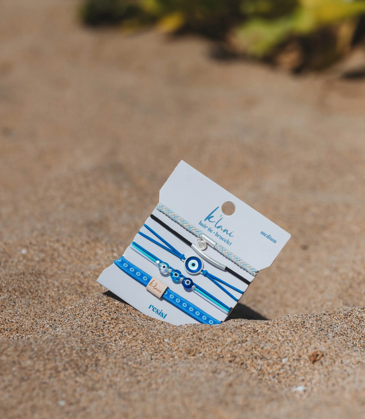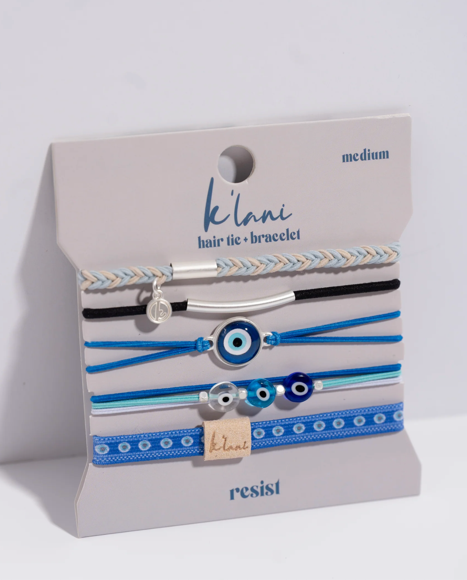 Elevate your everyday style with the K'lani Resist Hair Tie/Bracelet Set – where fashion meets intention. This stunning 5-piece collection features reflective blue tones and silver accents, anchored by the protective evil eye charm to help you resist envy and negative energy.
