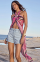 The Volcano Goddess Travel Scarf in vibrant hibiscus is your perfect getaway companion. Crafted from 100% LENZING™ Modal, it feels luxuriously soft and drapes effortlessly. Its playful frayed edges and removable sarong buckle offer versatile styling, letting you switch from a chic scarf to a breezy sarong in moments. One size fits all, making it easy to carry your island goddess vibe wherever you roam.