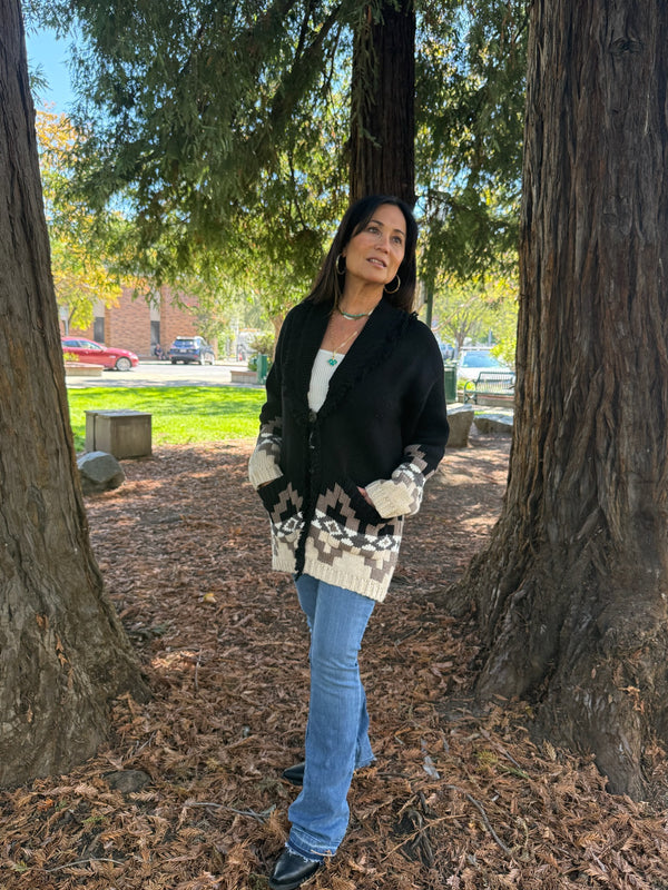 Embrace timeless Western charm with Western Print Cardigan. Made from a cozy chunky cotton blend, this shawl-collar cardigan showcases a striking Southwestern-inspired pattern along the hem and cuffs. The fringed collar adds elegant texture and soft movement, while the relaxed fit ensures effortless layering during cooler seasons. Perfect for adding a unique, boho touch to any outfit, this cardigan combines comfort and standout style with ease.