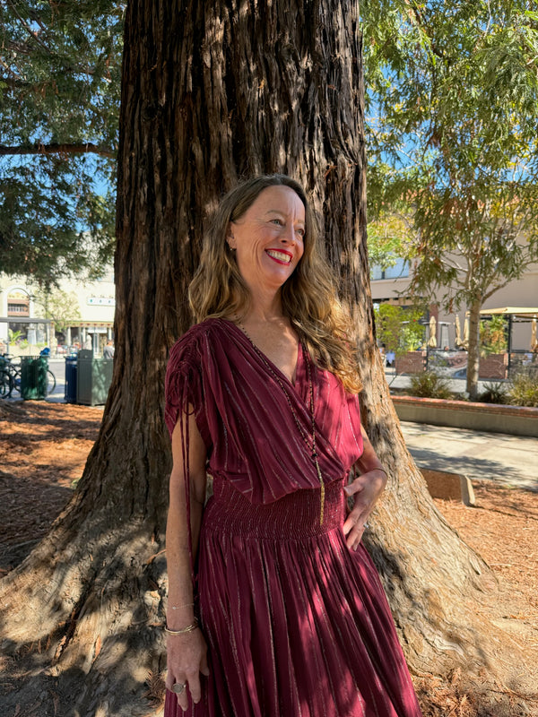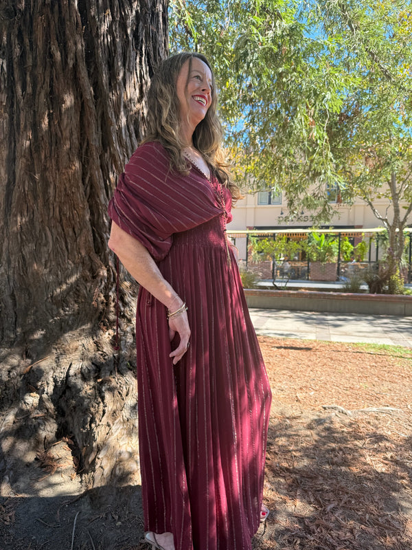 Elevate your style with the Tamia Long Lurex Dress in a rich wine color accented by subtle gold stripes. Featuring a smocked waist and yoke, this dress offers a flattering, blouse-like fit at the top with a deep V-neckline that adds a touch of allure. The cinched sleeves provide a customizable fit, while the flowy bottom creates graceful movement. Perfect for occasions when you want to feel confident and effortlessly elegant.