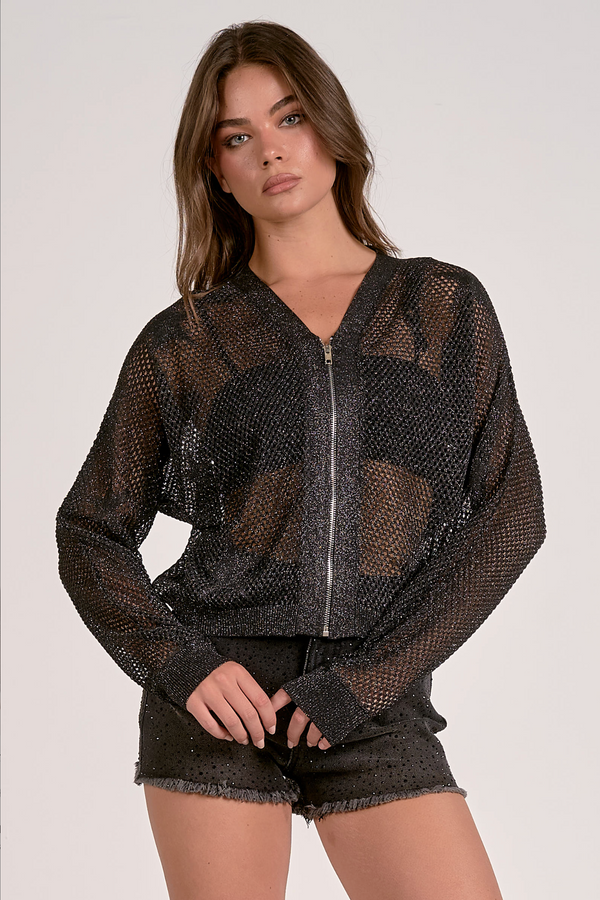 Reach for the stars with our stunning Star Embellished Knit Cardigan. This unique open weave knit sweater features charming star embellishments and a sporty bomber jacket silhouette, creating the perfect blend of casual cool and feminine flair. The zipper closure and coated knit trim add modern edge to this versatile layering piece that transitions effortlessly from day to night.