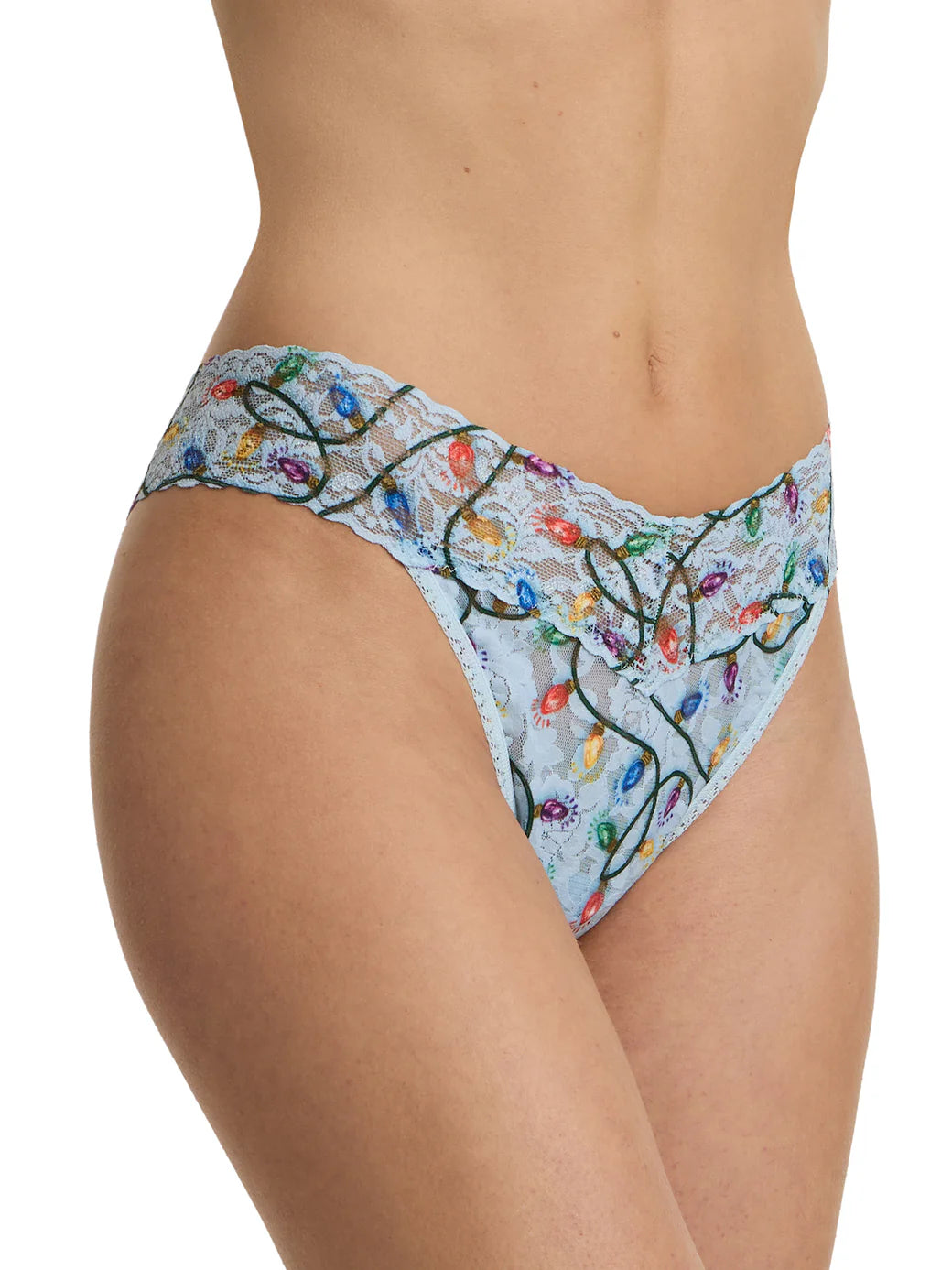 Get decked out for the holidays with this playful twist on Hanky Panky's iconic Original Rise Thong. Featuring colorful Christmas string lights printed on a light blue signature stretch lace, this festive thong brings holiday cheer to your lingerie drawer while delivering the legendary comfort you expect from Hanky Panky.