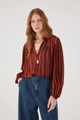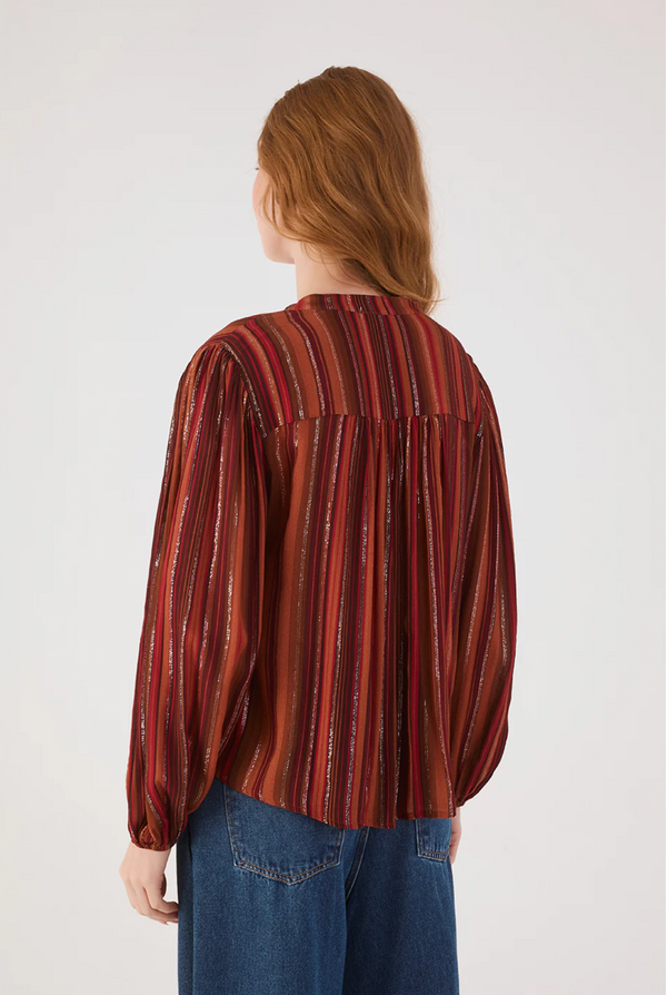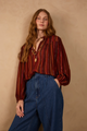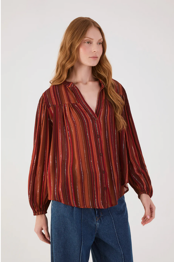 The Marabá Lurex Tunic in Refúgio Print blends comfort with elegance for the perfect fall statement. Made from lightweight lurex fabric, it features a button-up design, a flattering v-neckline, and blousey arms finished with elasticized wrists. Its multi-colored stripes in warm browns, red-browns, and a hint of gold bring a subtle shimmer to your seasonal wardrobe. Designed with a relaxed waist, this tunic offers both style and ease, making it an essential piece for embracing autumn’s timeless charm.