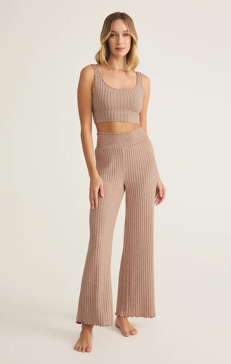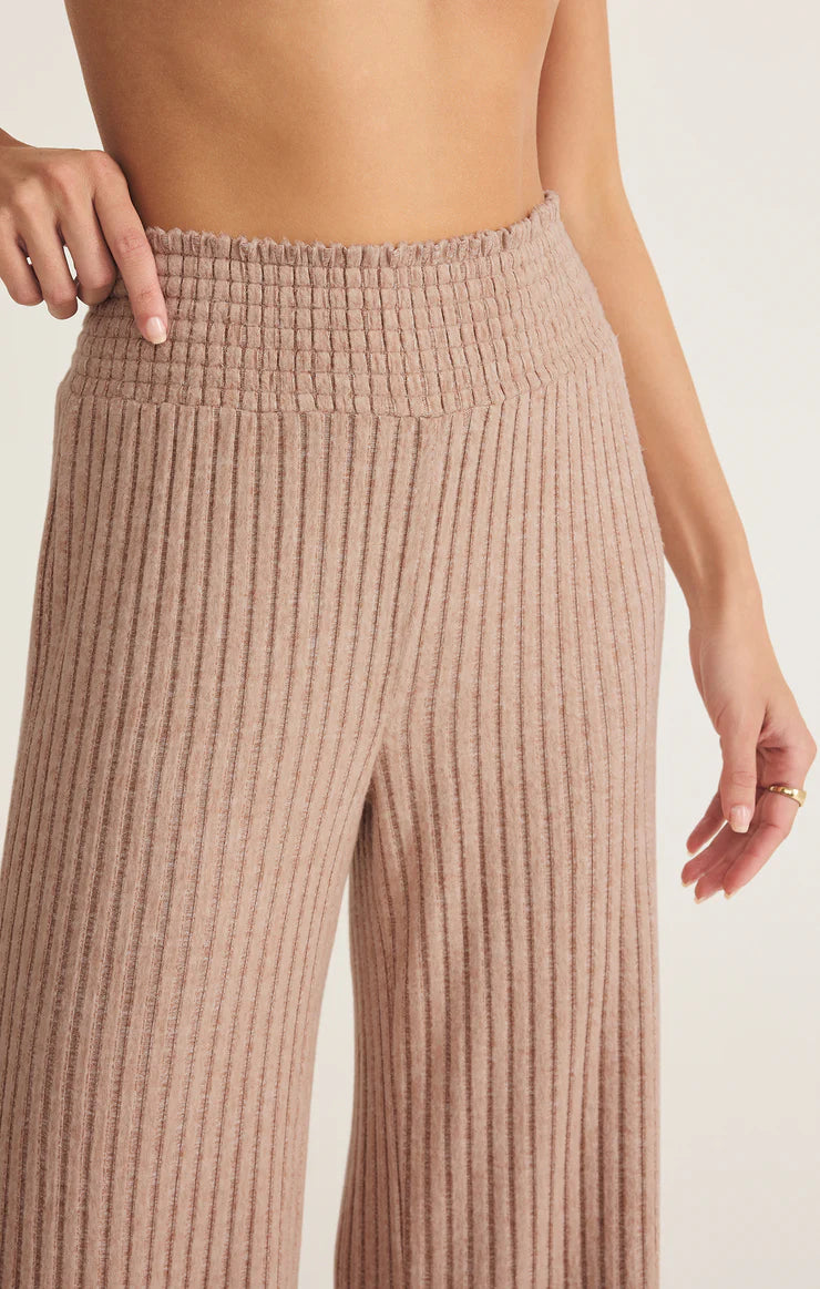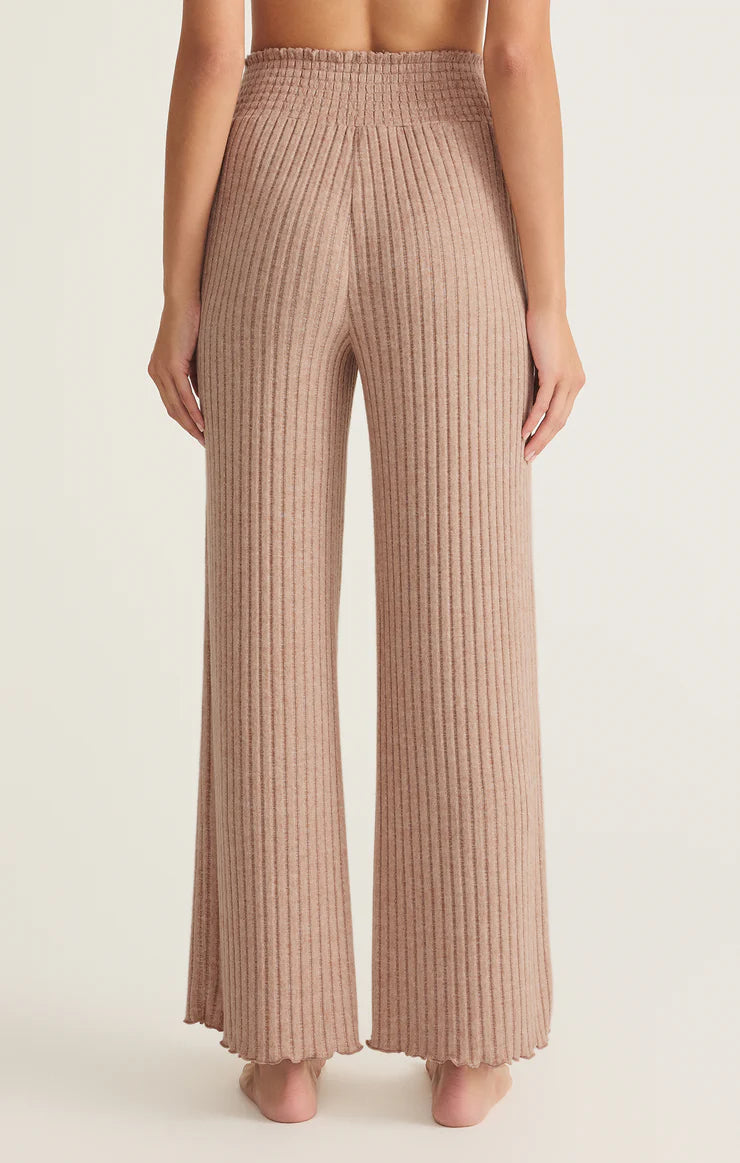 Experience all-day comfort with the ultra-soft Dawn Smocked Rib Pant in Iced Coffee. Made with our Silky Rib fabric and featuring a smocked waistband, high rise, and wide leg flare, this pant is perfect for relaxing. Machine washable for easy care.