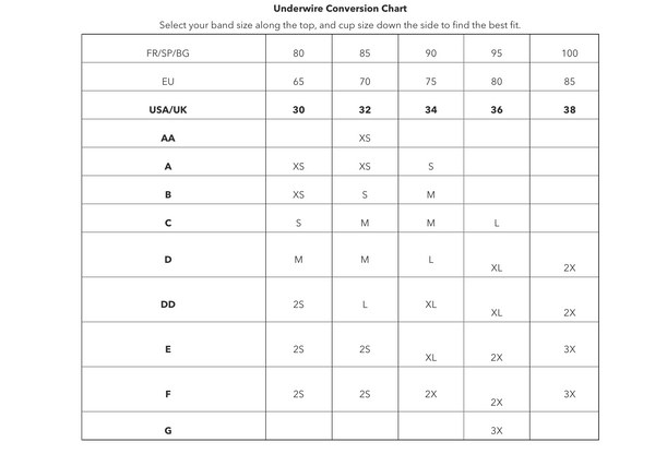 - Sizes: Small (32B, 34A, 34B), Medium (32C-D, 34C), Large (32DD, 34D, 36C)