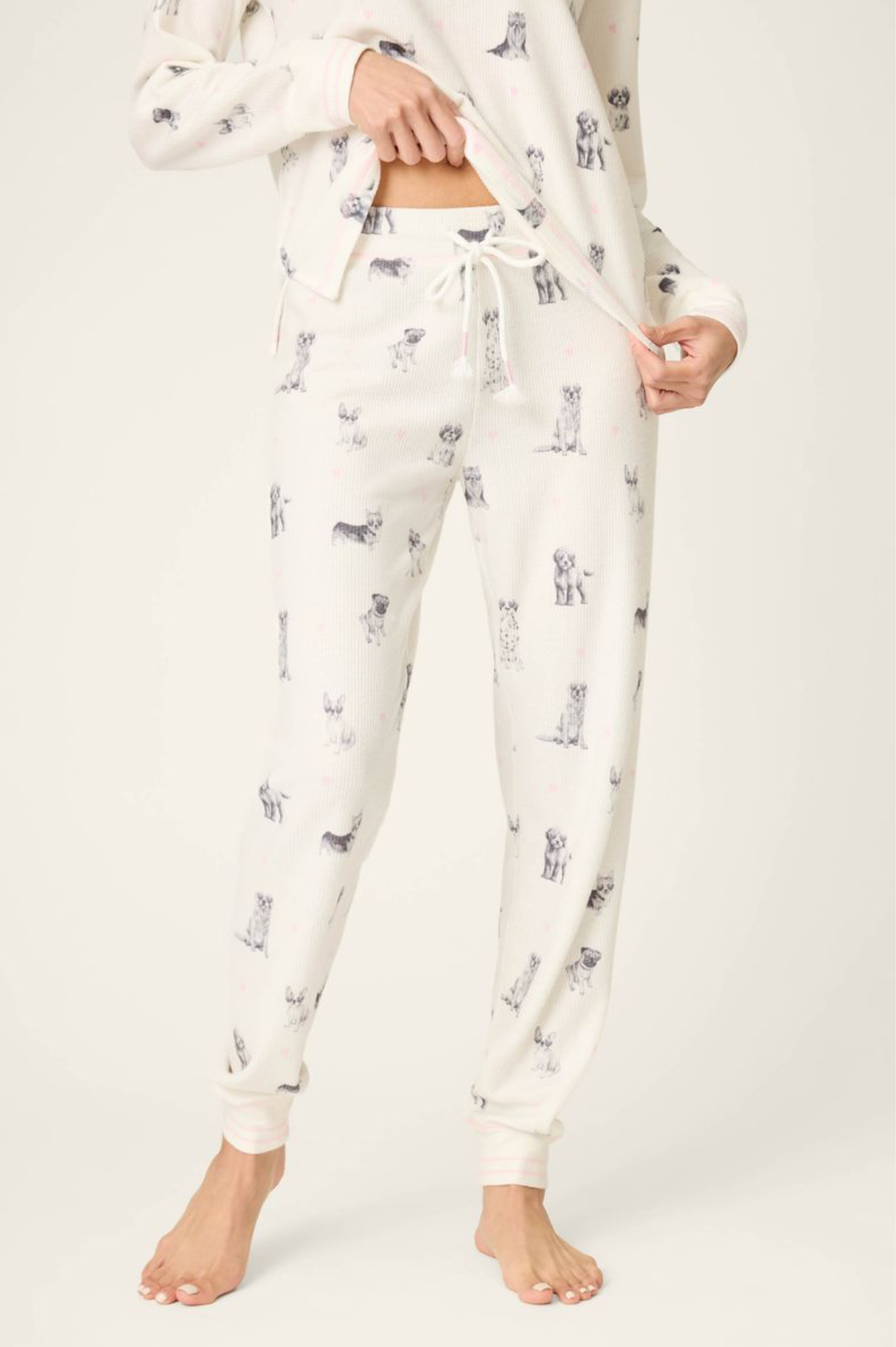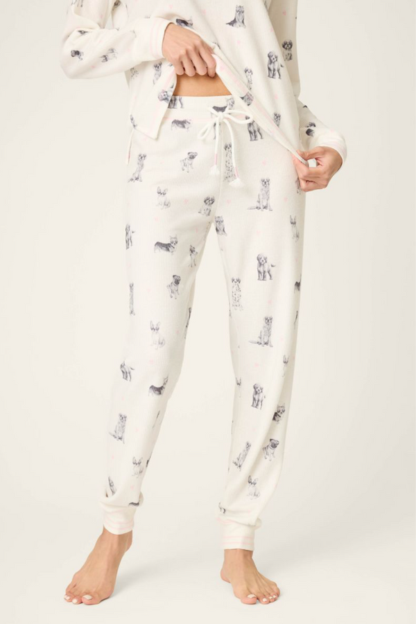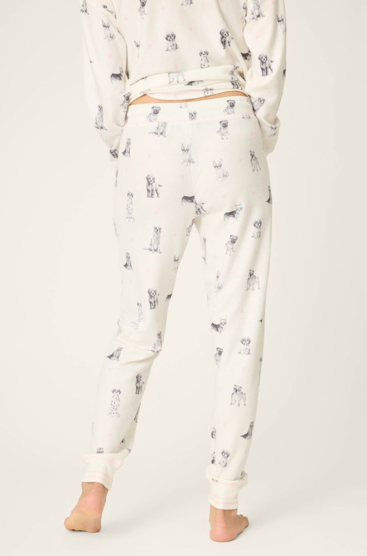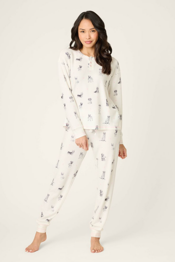 Celebrate the love of your furry best friend with this adorable Valentine's-themed pajama set. Featuring a classic henley top in crisp white adorned with playful dogs surrounded by little pink hearts, paired with comfortable banded pants with an adjustable drawstring, this set is perfect for dog lovers who know that true love has four paws.