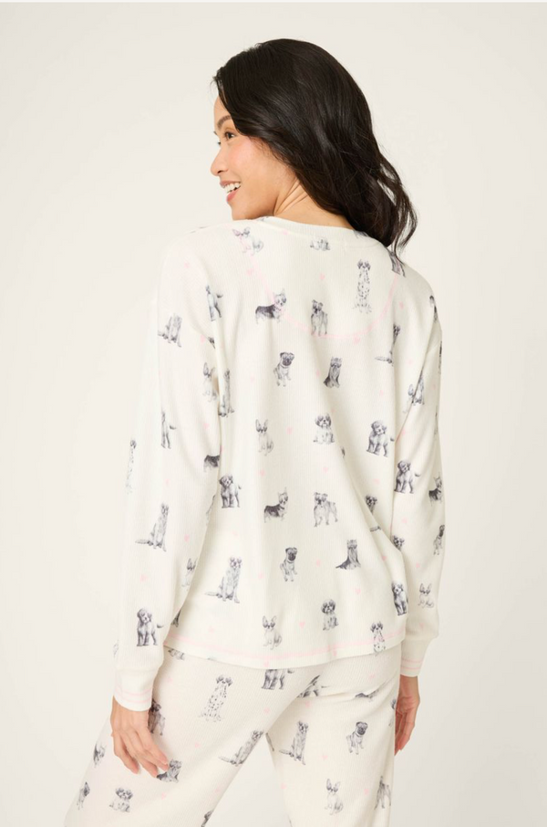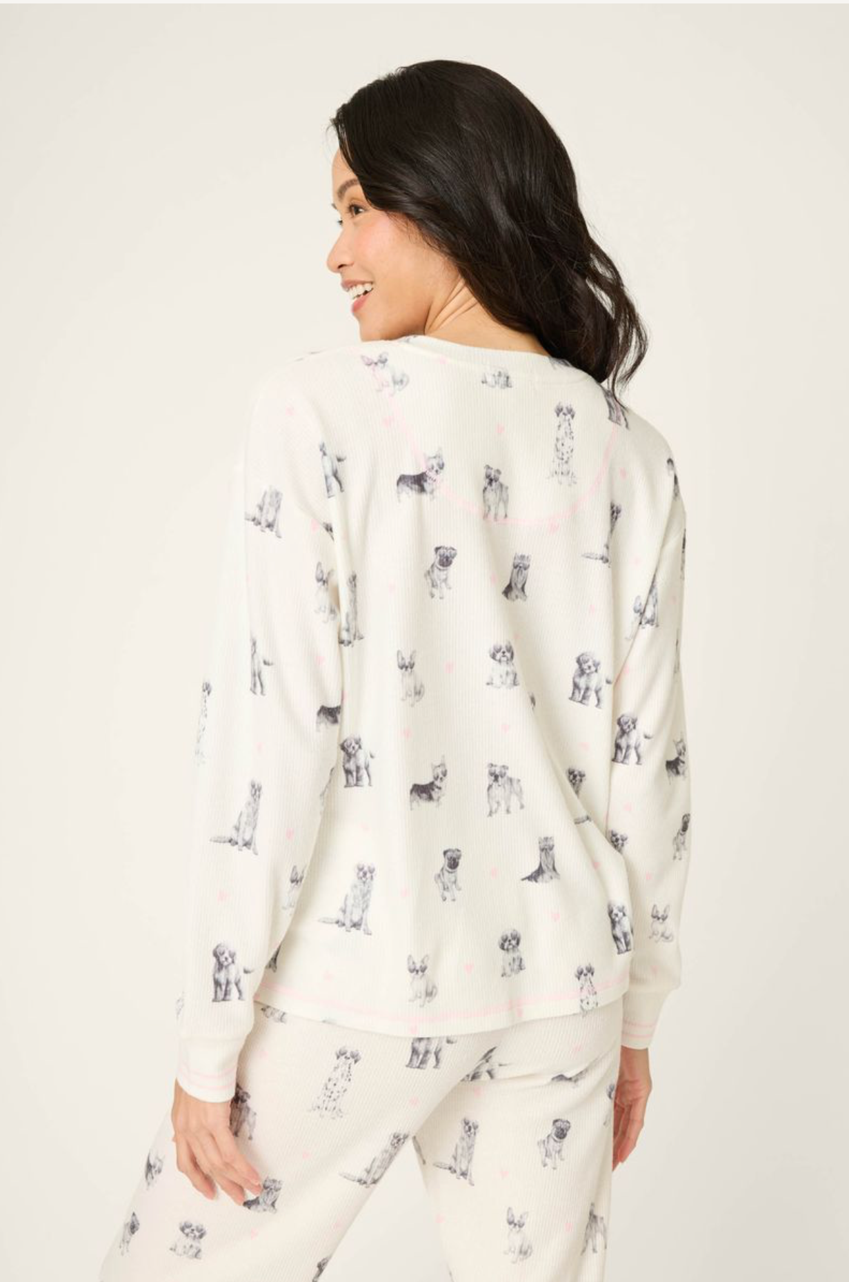 - Henley Top: Classic button placket neckline in white with charming dog and heart print