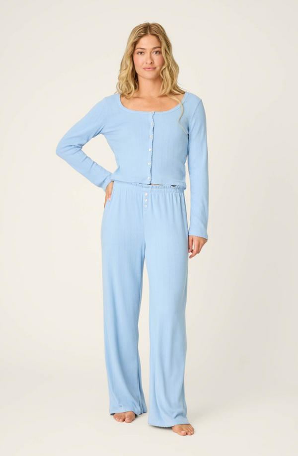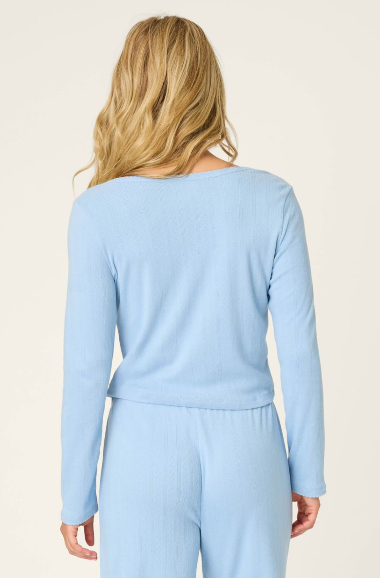 Embrace cozy elegance with this beautiful blue long sleeve pajama top. Crafted from luxuriously soft double brushed pointelle fabric, this button-front top features charming scalloped edges that add a delicate, feminine touch. The dreamy blue colorway and textured pointelle knit make this a standout piece in your sleepwear collection.