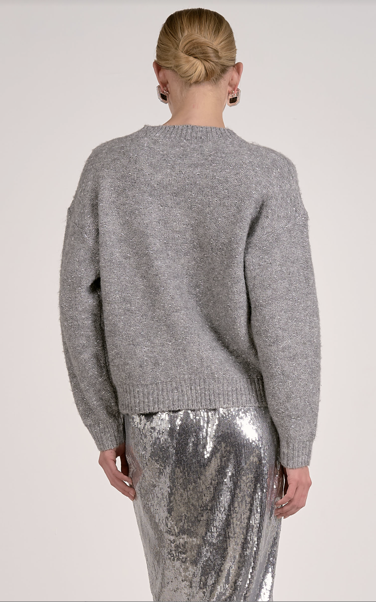 Embrace festive charm with this soft Bow Crew Neck Sweater in shimmering silver sequins. Crafted from a cozy blend of polyester, acrylic, and elastane, it offers gentle stretch and warmth—perfect for holiday gatherings. The delicate bow pattern adds a touch of elegance, making it an effortless statement piece for your seasonal wardrobe.