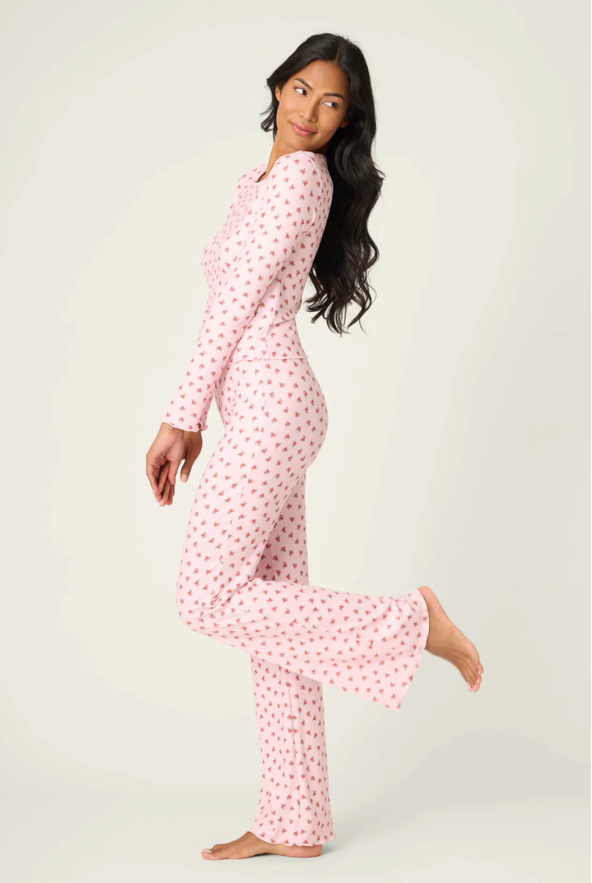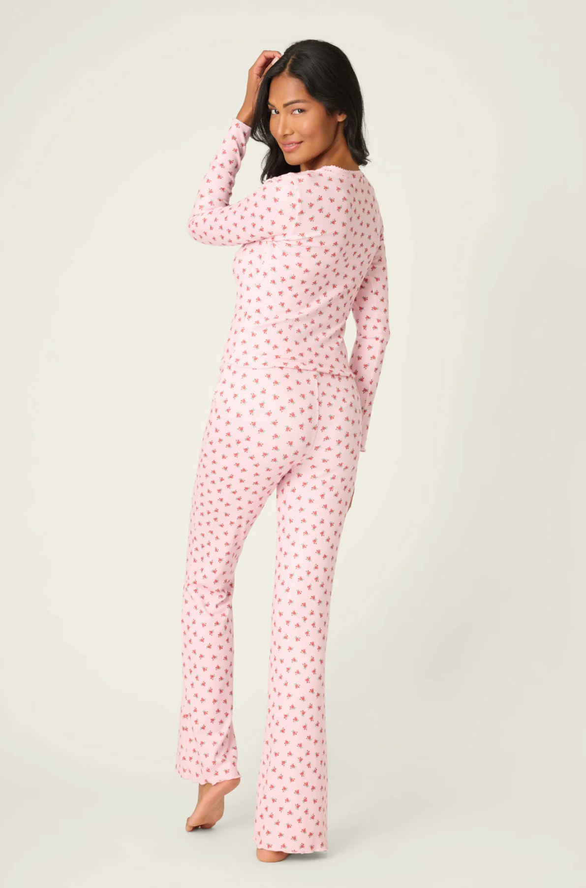 Classic girlhood charm meets holiday cheer in this pink pointelle pajama set that brings timeless elegance to your sleepwear collection. Featuring a delicate ditsy rose print, this two-piece set combines relaxed comfort with feminine sophistication, perfect for cozy nights and leisurely mornings throughout the season.