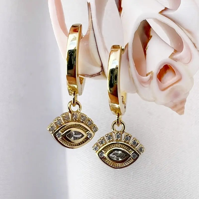 These Foresight evil eye huggies are dainty, fun piece to add to your earring game. It is made from 14K gold vermeil with chic cz details. As a symbol of protection, the evil eye can be traced back to ancient Greek and Roman texts and to the Bible and Quoron. It is believed that wearing these amulets protects the wearer from the negative energy and jealousy, which is usually directed towards a person who is unaware. The eye symbol has the dual capabilities of providing you with both protection and transcending power.