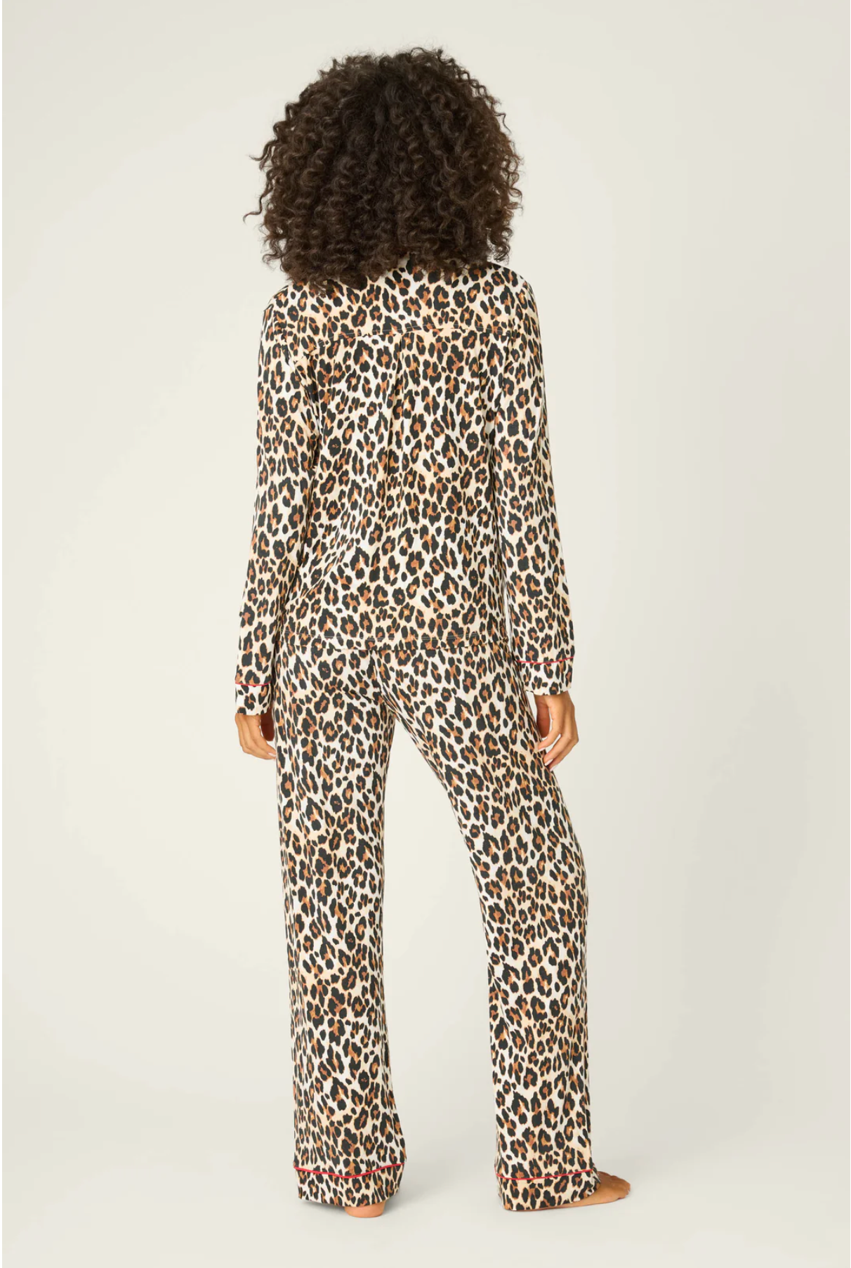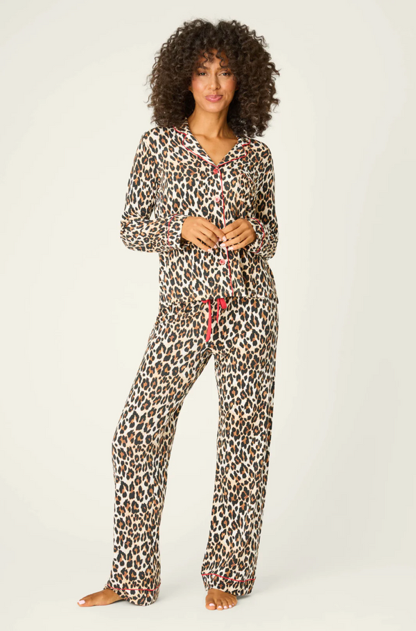 Unwind on the wild side in this ultra-soft modal jersey pajama set, patterned all over in classic leopard spots. The button-down top features elegant red piping and matching red buttons, while the relaxed drawstring pants tie with a festive red ribbon—an effortless way to add a fierce twist to cozy nights in.