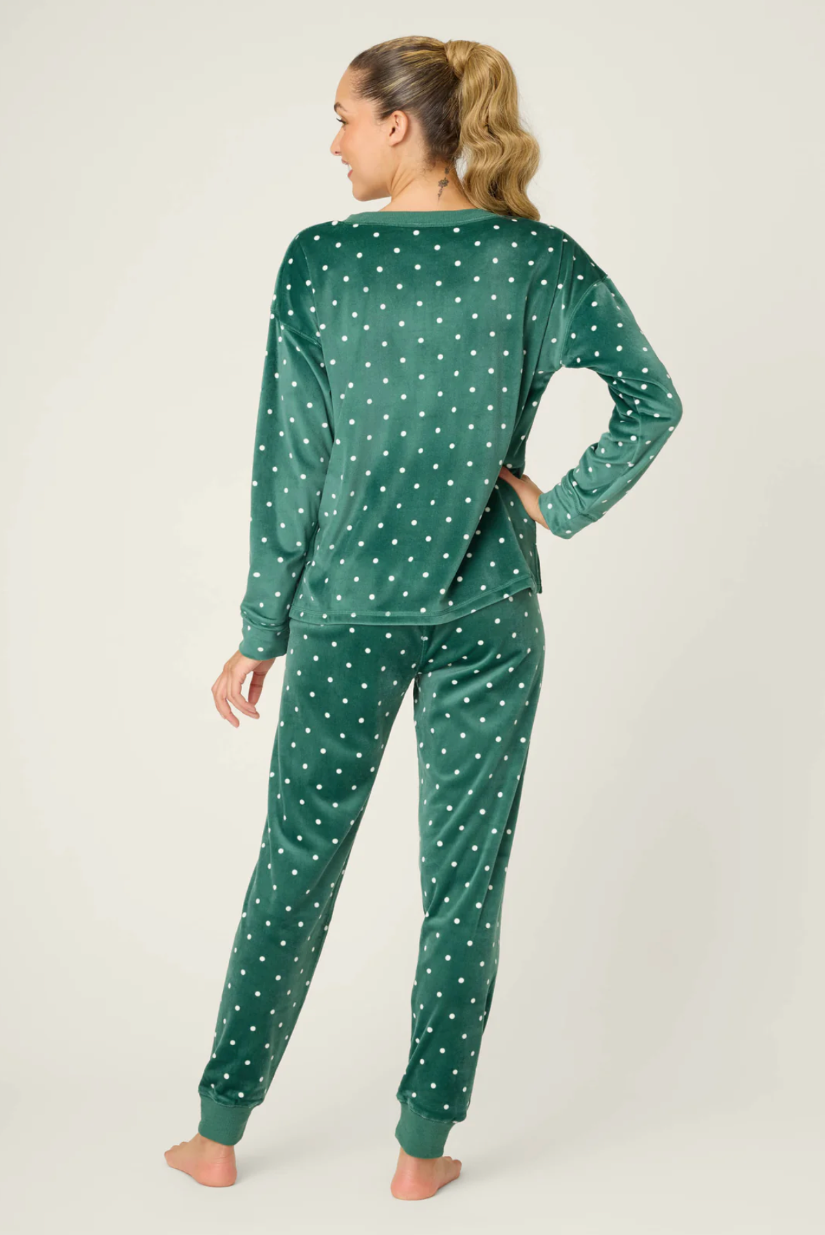 Silky-soft forest green velour makes this set as plush as it is festive. The long sleeve henley top features a classic button placket and banded cuffs, paired with jogger-style pants finished with a drawstring waist and cuffed hems. Scattered in playful white dots, it's made for holiday lounging that feels a little luxe.
