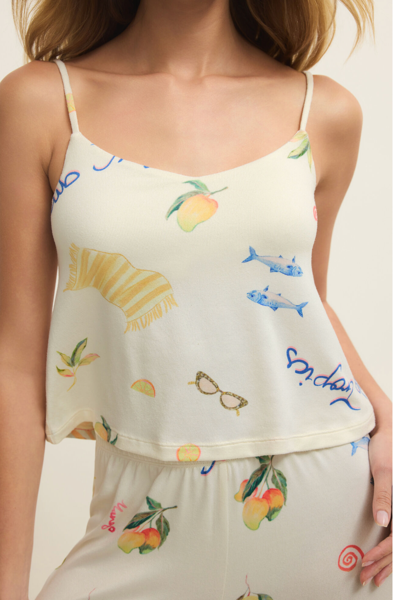 Slip into effortless comfort with the Marbella Cami in Vanilla Ice. This relaxed-fit essential features a luxuriously soft silky jersey blend that drapes beautifully against the skin. The sleeveless V-neck design pairs perfectly with layering or solo wear, while adjustable straps and a built-in shelf bra provide customizable support. Lightweight and breathable at just 18½" in length, it's an ideal piece for loungewear, layering, or warm-weather styling. Crafted from 95% polyester and 5% spandex for gentle stretch and durability. Pair it with the Vintage Tropic Pant - Vanilla Ice.