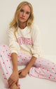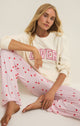 - Varsity LOVER Graphic: Bold light pink letters with red outline create a playful, romantic statement