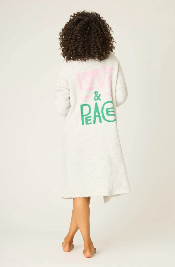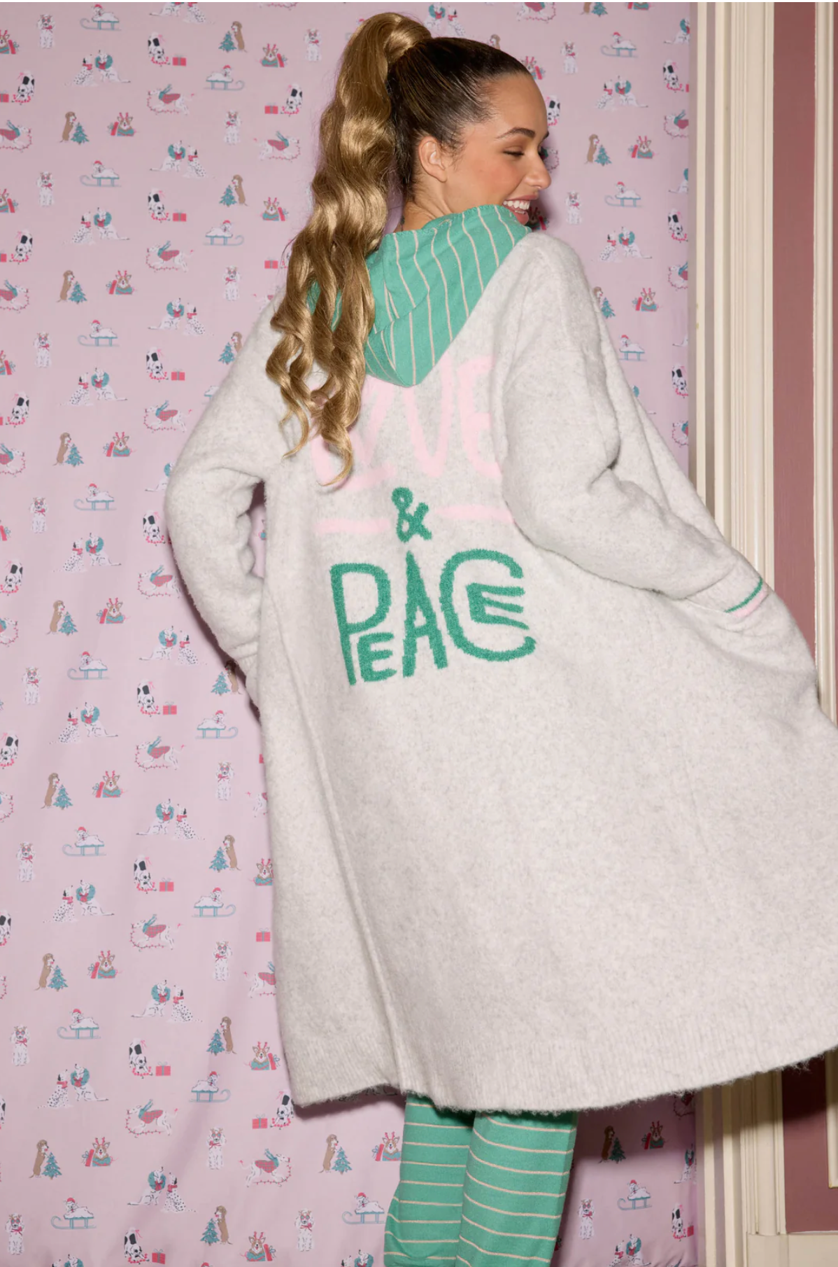 Peace, love, and all the cozy feels. This heathered cardigan in soft sweater knit features an open-front silhouette with pink and green trimmed cuffs and pockets. Across the back, a bold "love & peace" graphic makes it a standout layer for festive lounging and spreading holiday cheer.