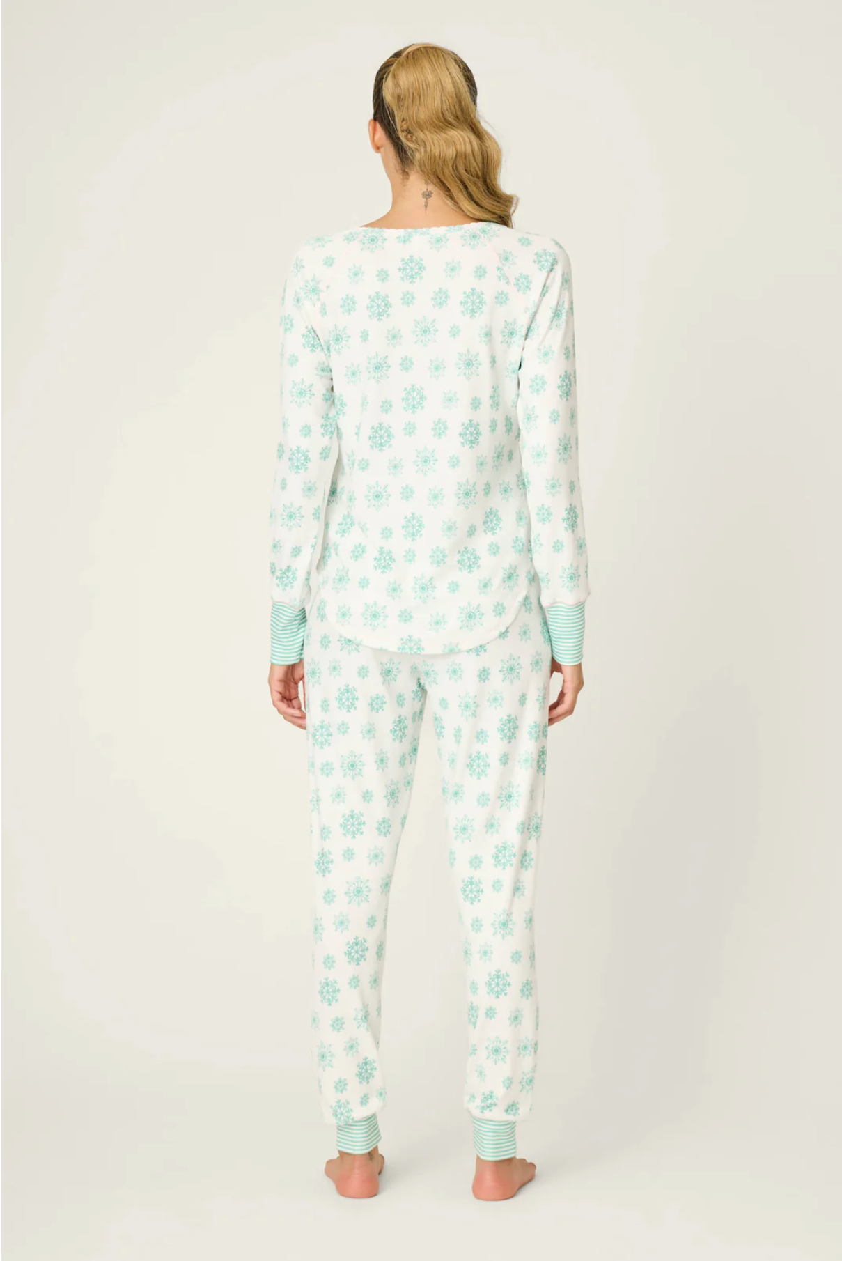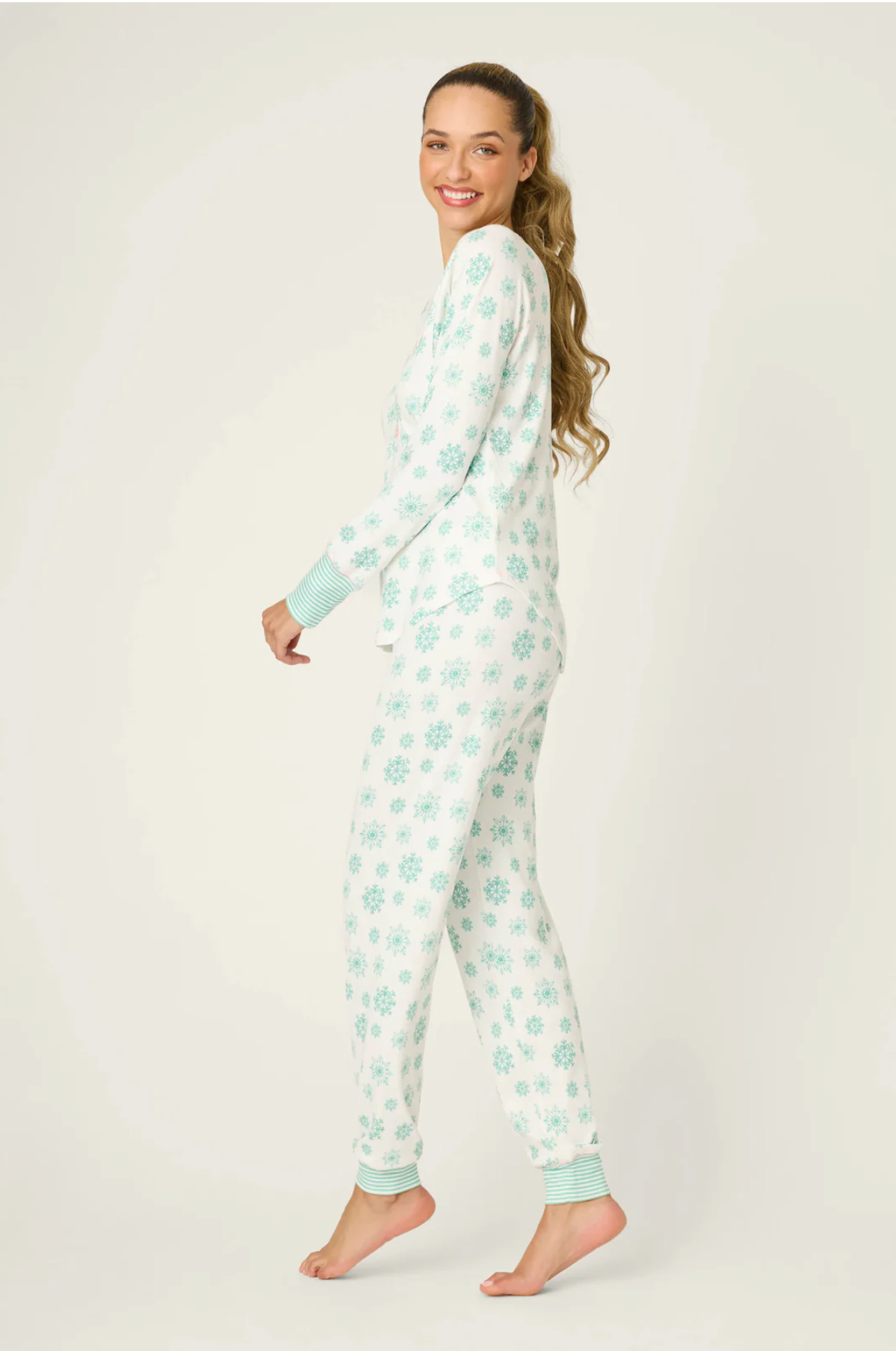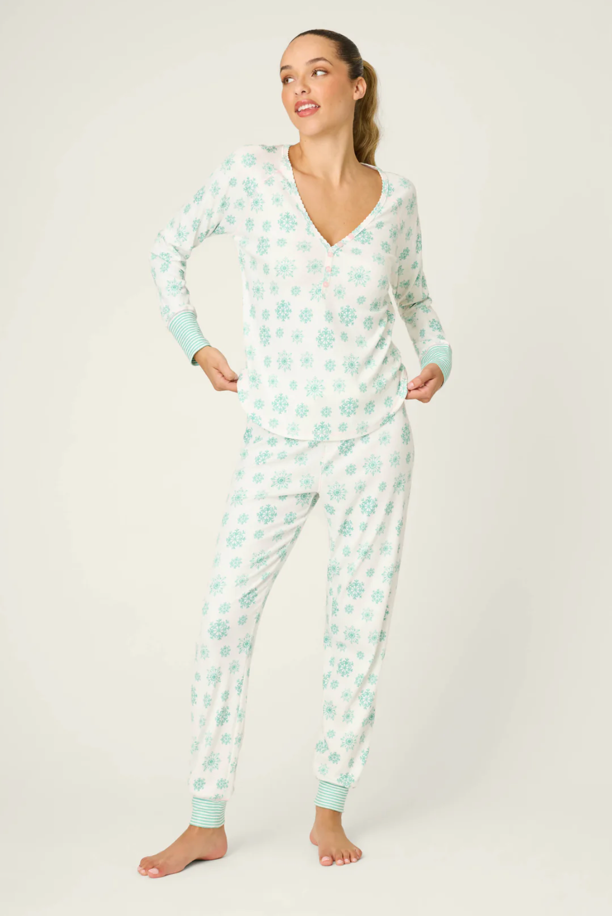 All the charm of a snow day, minus the chill. This brushed pointelle pajama set is patterned with green snowflakes, pairing a V-neck henley top with striped cuffs and jogger pants tied with a pink ribbon. Soft and festive, it's a holiday essential for cozy nights in and frosty mornings.